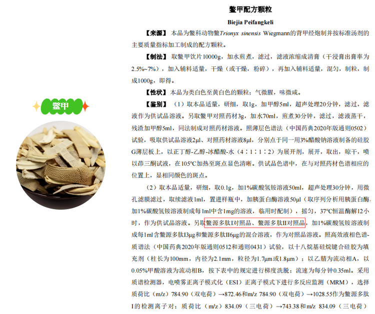 鱉甲來源于鱉科動(dòng)物鱉Trionyx sinensis Wiegmann 的背甲,常以生鱉甲醋炙,可去除其腥味,藥性易于煎出。鱉甲具有滋陰潛陽,軟堅(jiān)散結(jié),退熱除蒸的功效,臨床主要用于治療陰虛發(fā)熱,虛風(fēng)內(nèi)動(dòng),癥瘕等病癥。普思生物新品鱉源多肽I、鱉源多肽II對(duì)照品,有效對(duì)鱉甲、醋鱉甲配方顆粒進(jìn)行質(zhì)量控制。