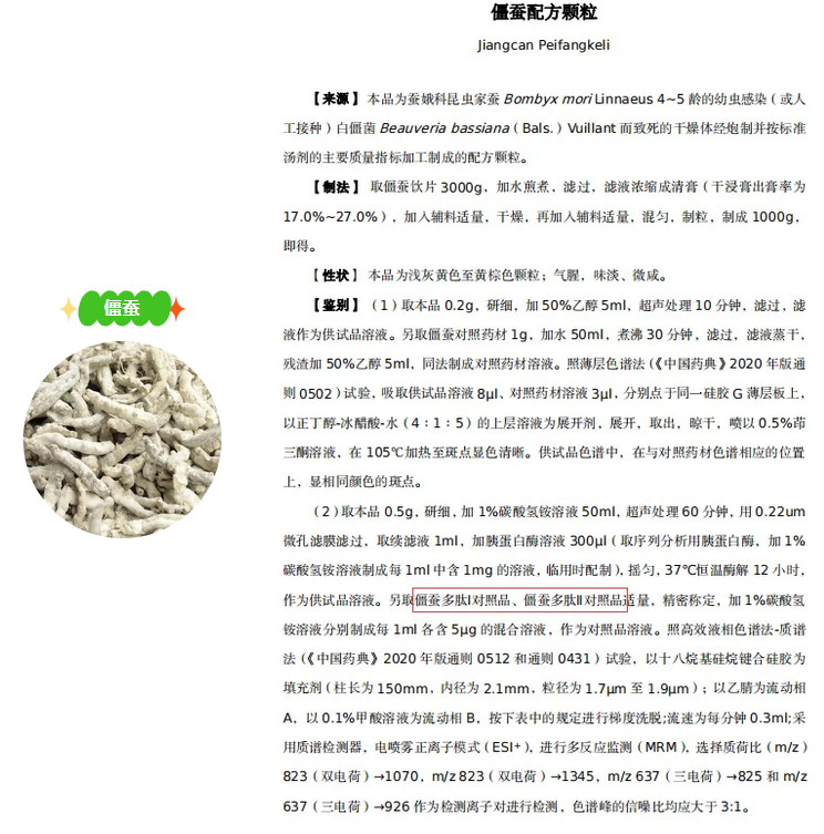 僵蠶為蠶蛾科昆蟲家蠶Bombyx mori Linnaeus 4?5齡的幼蟲感染(或人工接種)白僵菌Beauveria bassiana (Bals.) Vuillant而致死的干燥體,具有息風(fēng)止痙、祛風(fēng)止痛、化痰散結(jié)的功效。普思生物新品僵蠶多肽I、僵蠶多肽II和僵蠶八肽對(duì)照品,有效對(duì)僵蠶、炒僵蠶配方顆粒進(jìn)行質(zhì)量控制。