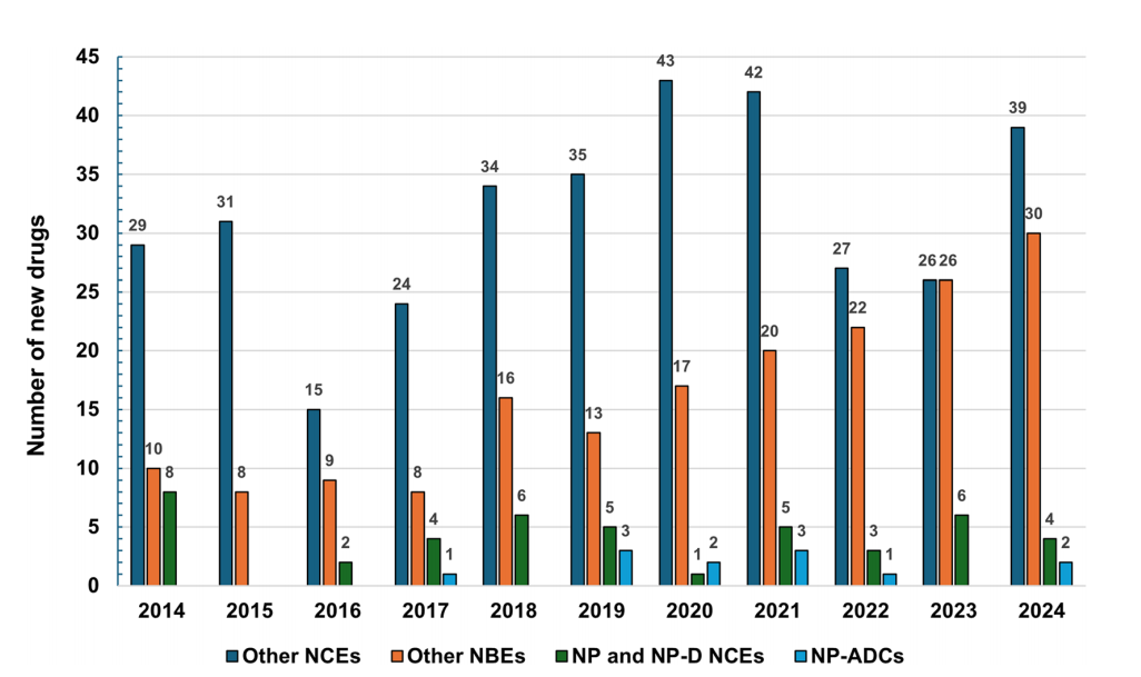 2014-2025 年 6 月,全球共批準 58 種天然產(chǎn)物相關藥物,包括 45 種 NP/NP-D 新化學實體(NCEs)和 13 種 NP-ADCs。在 2014-2024 年全球獲批的 579 種新藥(388 種 NCEs、191 種新生物實體 NBEs)中,天然產(chǎn)物相關藥物占 9.7%(56 種),其中 NCEs 占 7.6%(44 種),NBEs 中 NP-ADCs 占 6.3%(12 種)。這些藥物年批準量波動于 0-8 種,年均 5 種,雖非研發(fā)主流,但產(chǎn)出穩(wěn)定。值得關注的是,中國、印度等國的中小制藥企業(yè)在天然產(chǎn)物衍生藥物首次批準中的占比持續(xù)提升,成為核心推動力。