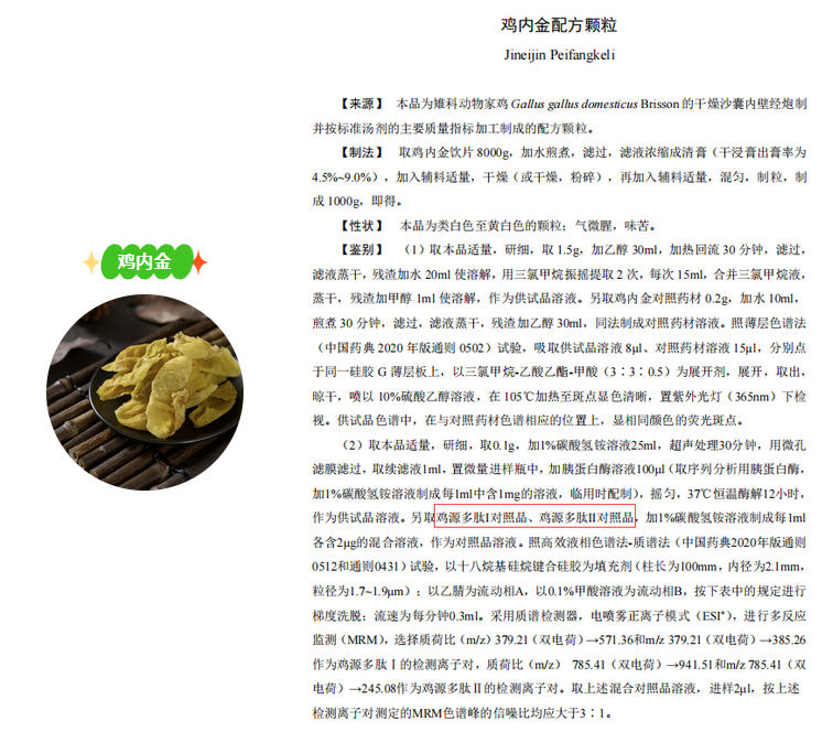 雞內(nèi)金為雉科動(dòng)物家雞Gallus gallus domesticus Brisson的干燥沙囊內(nèi)壁,具有健胃消食,澀精止遺,通淋化石的功效,臨床上廣泛應(yīng)用于食積不化、小兒疳積、遺尿、遺精,又可用于膽結(jié)石、尿路結(jié)石等病癥的治療。普思生物新品雞源多肽I、雞源多肽II對(duì)照品,有效對(duì)雞內(nèi)金、炒雞內(nèi)金配方顆粒進(jìn)行質(zhì)量控制。