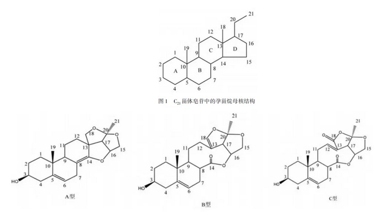 1、甾體皂苷苷元均以孕甾烷(圖1)或其異構體為基本骨架,C、D環(huán)易發(fā)生變形,D環(huán)氧化成3個四氫呋喃環(huán)(A型)或苷元骨架中的六元C環(huán)和五元D環(huán)氧化斷裂成九元環(huán)的飽和內(nèi)酯(B型)及不飽和內(nèi)酯(C型);