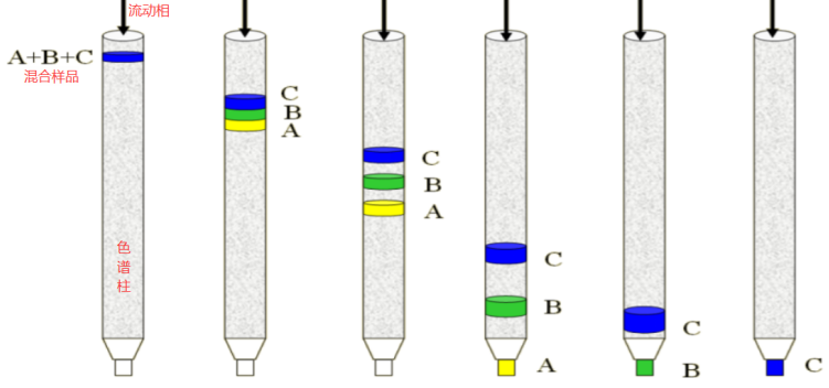 基于吸附色譜,即利用混合物中各組分在兩種不相混溶的相(固定相和流動(dòng)相)之間分配平衡的差異,從而實(shí)現(xiàn)分離。一般極性大的化合物與硅膠的吸附作用強(qiáng),不容易被洗脫下來(lái),在柱中移動(dòng)得慢;極性小的化合物與硅膠吸附作用弱,容易被溶劑洗脫下來(lái),移動(dòng)得快。從而實(shí)現(xiàn)按極性從小到大依次被洗脫分離。
